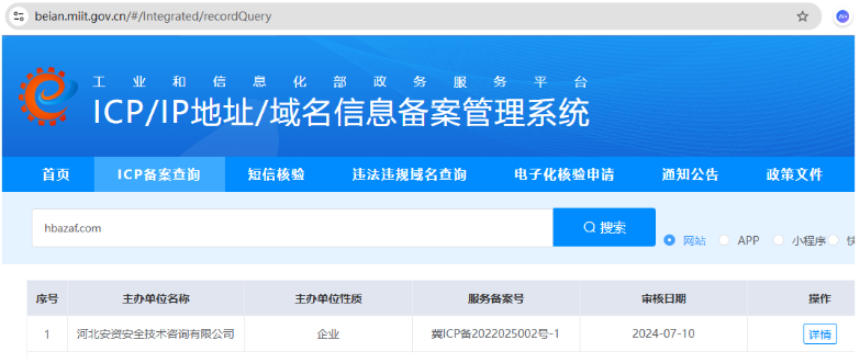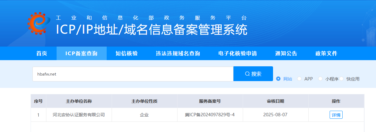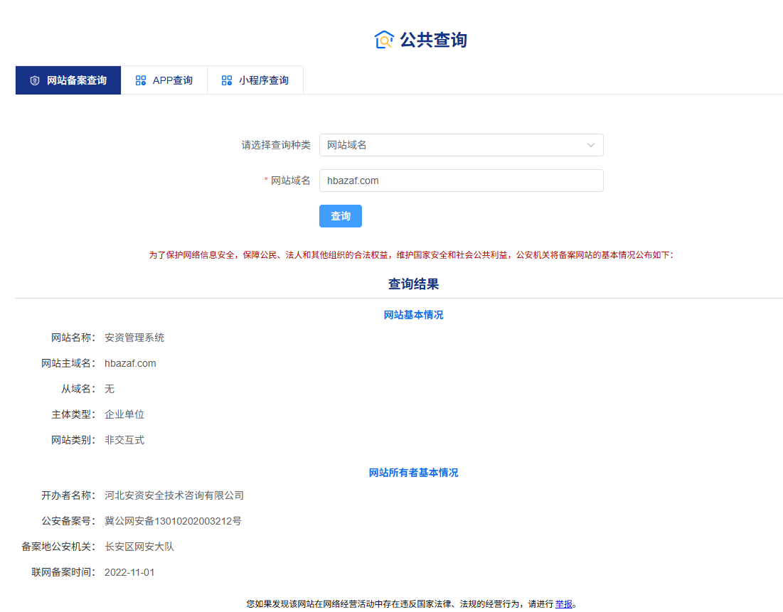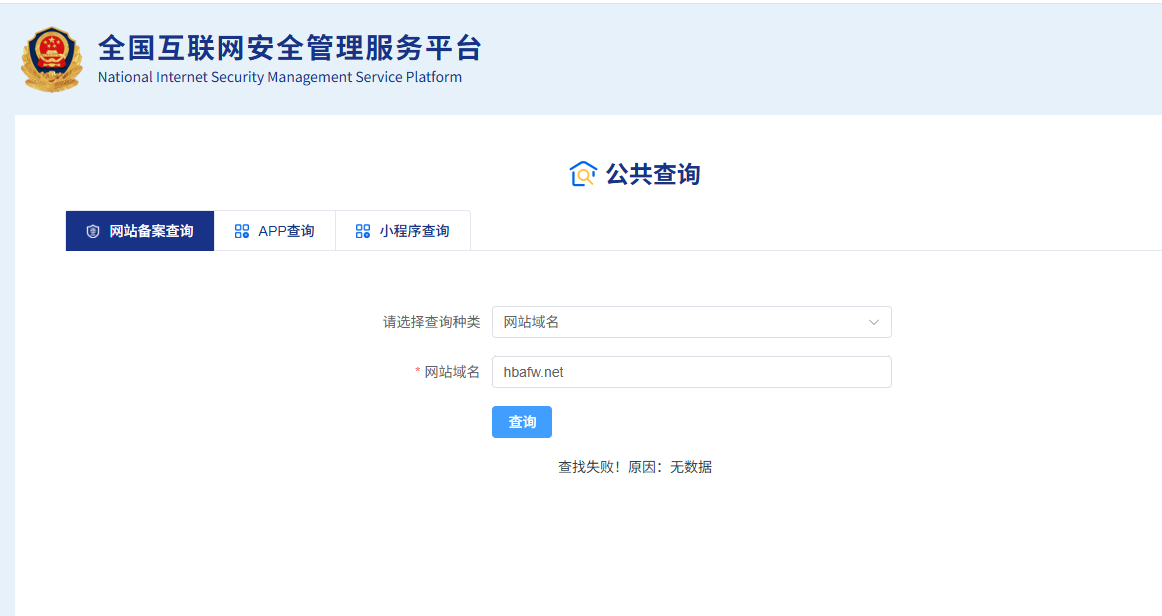 经工信部、全国互联网安全管理服务平台公开查询:对方运营的 hbafw.net 网站仅办理了 ICP 备案,未取得公安网安备案(冀公网安备号),并非其宣传的“官方备案平台”,其所谓“公安行政备案资质”为虚假信息。